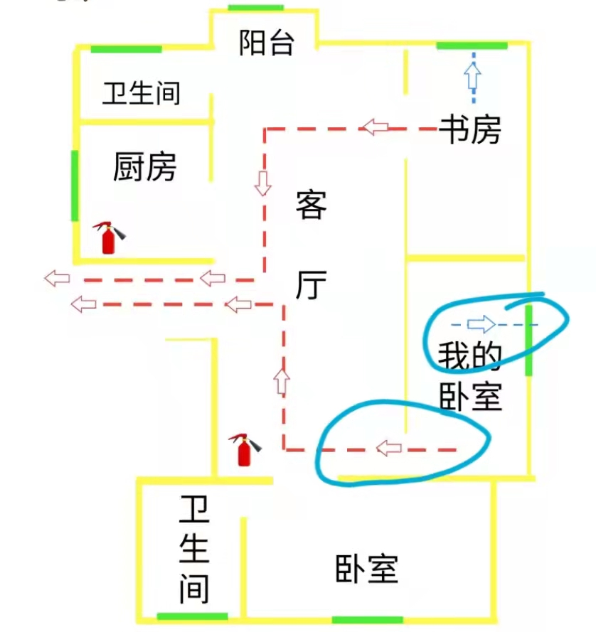 尽量为每个房间画出消防逃生路线,房门是每个房间的主要逃生出口,但如果房门被大火和浓烟封堵,就需要另外一个逃生出口,例如窗户。所以一定要确保家里的窗户能够自如开启,如果窗户安装了防盗网,那么一定为防盗网开设逃生窗,但是切记不要盲目跳楼逃生。